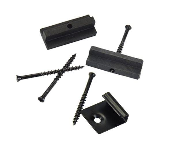 Teranna starter clips are used to secure the first deck board on the open end of the deck facing the home with the remaining standard clips being used to secure the inside of the decking boards. Both sets of clips are hidden within the finished composite decking project.